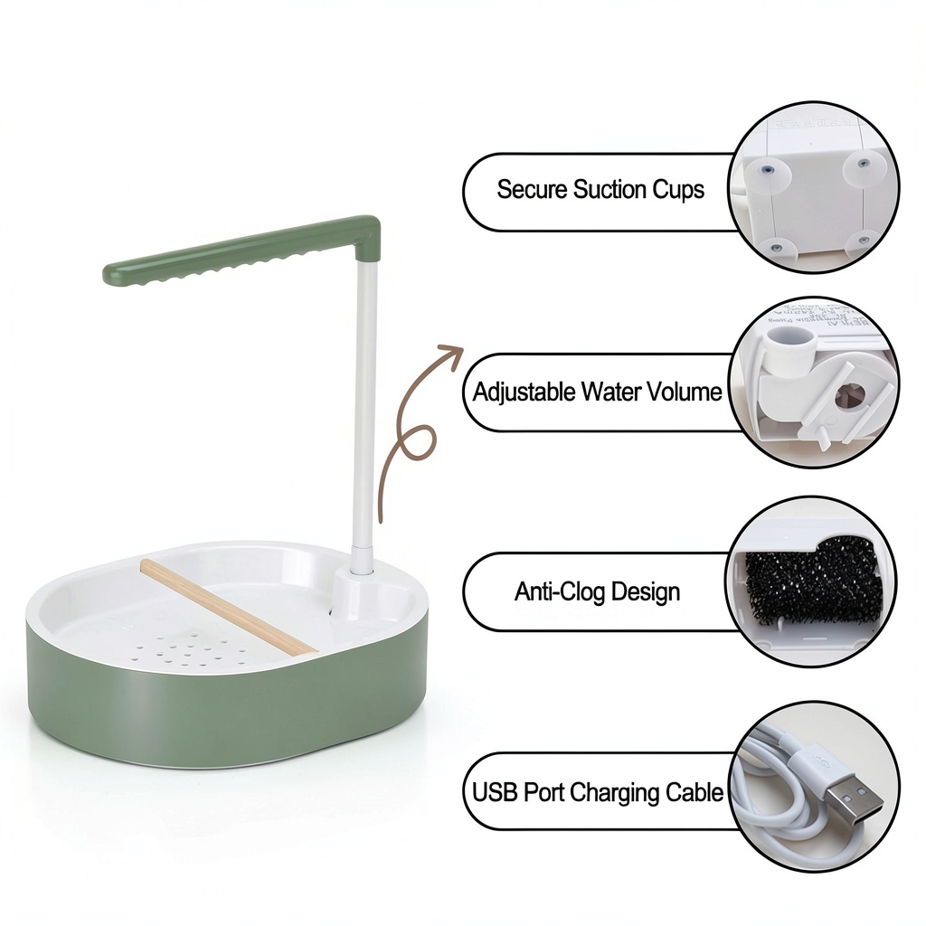 Simply connect the USB pump to a power source, attach the sprinkler pipe, and fill the basin with water. No tools are required, and the process takes only a few minutes.